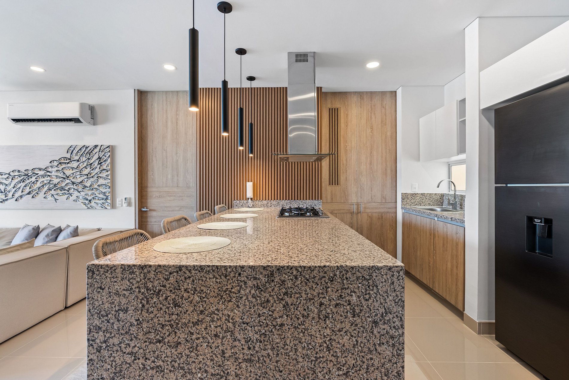 ¡Bienvenidos al paraíso! Este apartamento de tres habitaciones lujoso y moderno está ubicado cerca del mar en un condominio exclusivo que cuenta con todo lo necesario para unas vacaciones inolvidables. Sumérjase en la piscina de adultos o diviértase con sus hijos en la piscina infantil mientras se relaja en los jacuzzis. Disfrute de una playa privada y un restaurante con deliciosos platos y un bar con cocteles exclusivos. Además, podrá organizar barbacoas en la zona de BBQ. Este sector exclusivo y tranquilo garantiza una estancia privada y lujosa. ¡Esta es la escapada perfecta!