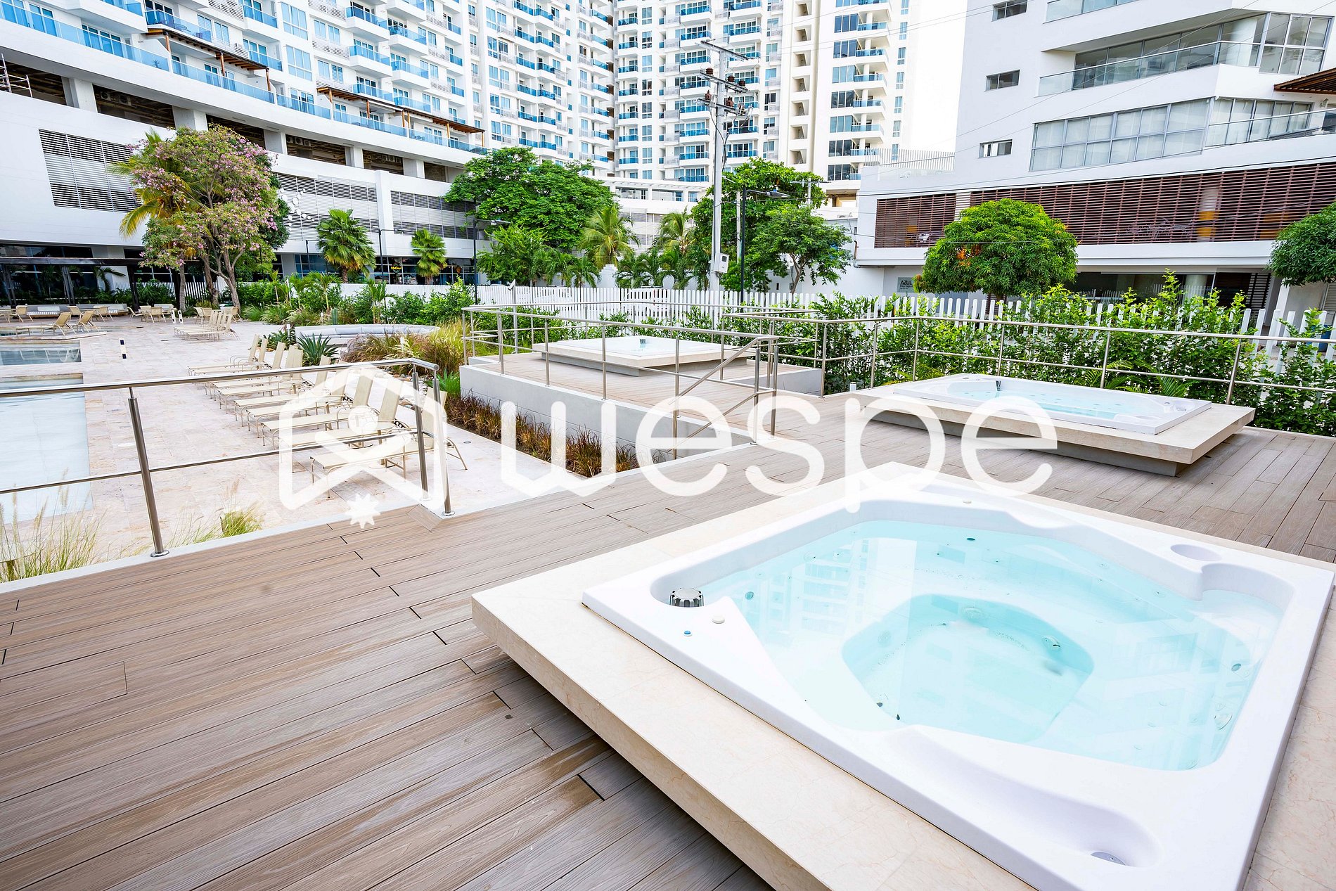 Los espacios que componen el condominio son: -Piscina de adultos y niños con tobogán piso 19 Torre 1 -Piscina de adultos semiolímpica piso 19 Torre 3 -Zona de Jacuzzis piso 19Torre 2 -Zona de Jacuzzis piso 19Torre 3 -Bar piso 19 -BBQ piso 19 -Restaurante piso 18 -Zona de Juegos Infantiles piso 18 -Zona de TV piso 18 -Gimnasio piso 18 -Canchas de futbol piso 18 -Piscina de Adultos y niños piso 1 Torre 4 -Salón Lounge piso 1 Torre 4 -Zona de Café/Bar piso 1 Torre 4 -Jacuzzis piso 1 Torre 4 -Zona de Playa Piso 1 (Sendero Interno Piso 1) -Quioscos de Playa -Carpas de Playa -Bar de Playa Estos funcionan de acuerdo al horario y disponibilidad de cada zona.